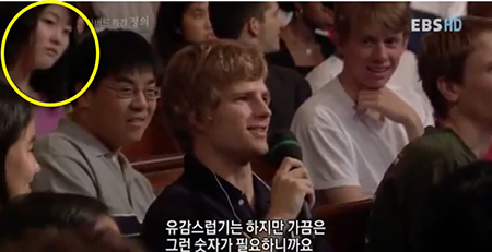 공개된 사진은 지난 2011년 1월 EBS에서 방송된 '하버드 특강-정의' 편에서 강의를 방청하는 신아영의 모습이 캡처된 것으로 그는 화장기 없는 얼굴에 지금보다 앳된 모습, 학생같은 수수한 복장으로 강의를 듣고 있었다.