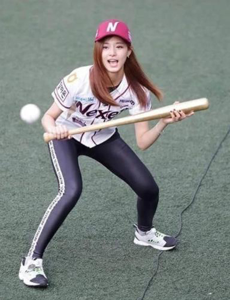 포착된 사진 속에는 쯔위가 넥센의 유니폼과 모자를 착용하고 몸에 달라붙는 검은색 레깅스를 입고 번트 폼을 잡고 섹시한 자태를 선보이는 모습이 담겨있다.