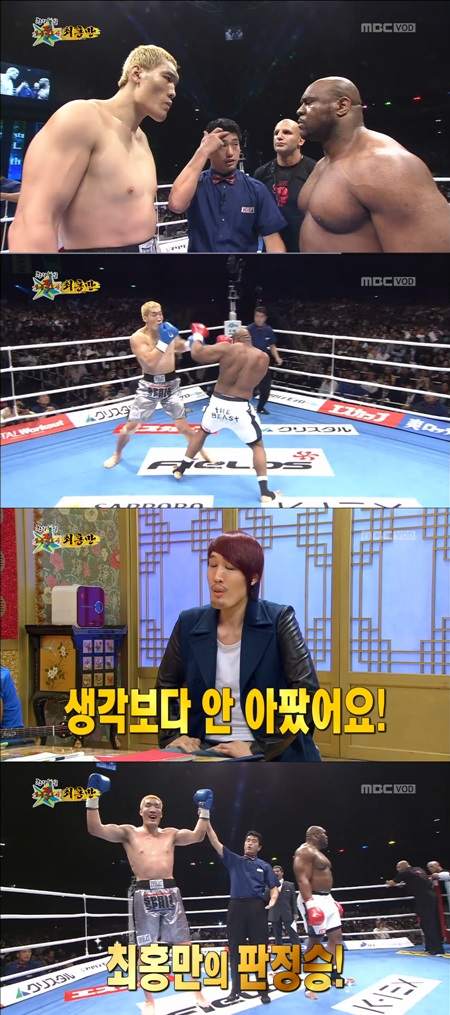 이어 최홍만은 "처음에는 겁이 많이 났지만 막상 한 대 맞고 나니까 생각보다 안 아팠다"며 "내가 판정승으로 이긴 후 선수가 올라오는 순서에 밥샙이 불참했다"고 밝혀 눈길을 끌었다.