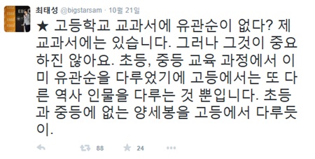 지난 21일 최태성은 자신의 트위터에 "고등학교 교과서에 유관순이 없다?"라는 글을 게재했다.