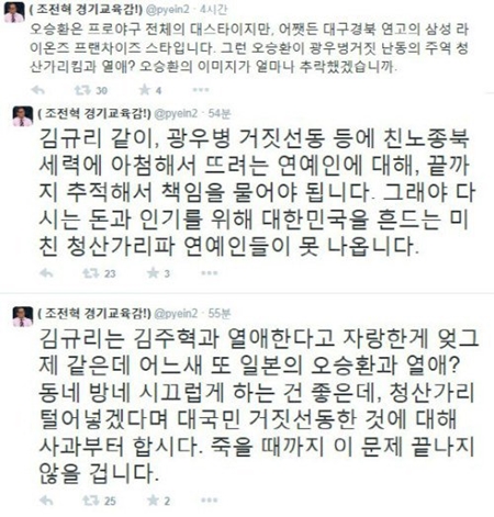곧이어 열애설 부인 소식이 전해지자 변희재는 "김규리 오승환 열애설 모두 부인? 연예판에서 허위 스캔들 터지면 절반 정도는 언론사에서 조작, 절반은 연예인이 뜨려고 직접 조작합니다. 분명한 건, 청산가리킴과 열애설 터졌을 때, 대구경북 쪽 팬이 많은 오승환이 큰 피해를 입었다는 거죠"라고 설명했다.