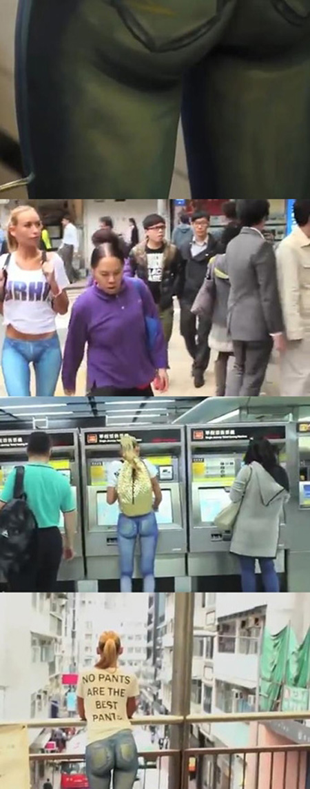 지난 11일(현지 시간) 영국 매체 '데일리메일'은 청바지 문양을 보디페인팅 한 채 홍콩 시내를 활보한 여성의 영상을 소개했다.