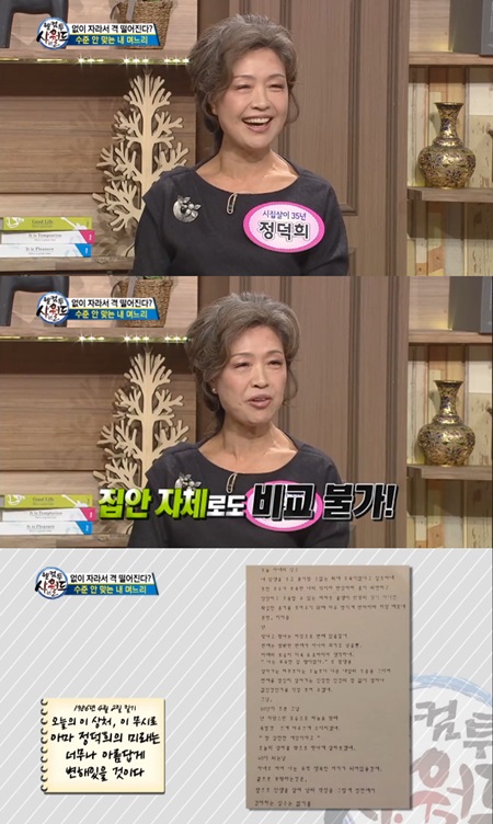 이어 정덕희는 "결혼 8년 만에 '울고만 있지 말고 내 상품성을 높여야겠다'고 마음을 먹었다"며 과거 시댁 식구들의 말을 적어 놓은 일기를 공개했다.