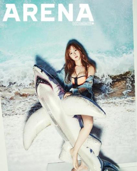 당시 공개된 화보 속에는 유소영이 다리로 상어 모양 튜브를 끌어안은 채 카메라를 응시하고 있는 모습이 담겨있다.