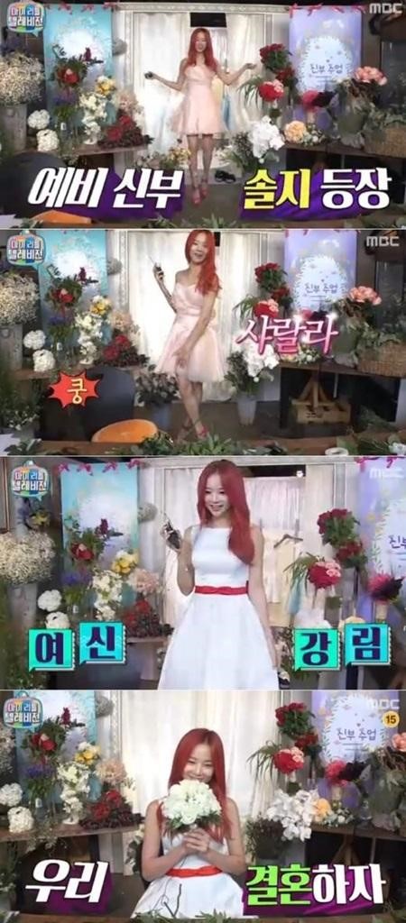 지난달 17일 방송된 MBC '마이리틀텔레비전'에서 EXID 솔지는 셀프웨딩을 준비하는 콘셉트의 방송을 진행했다.