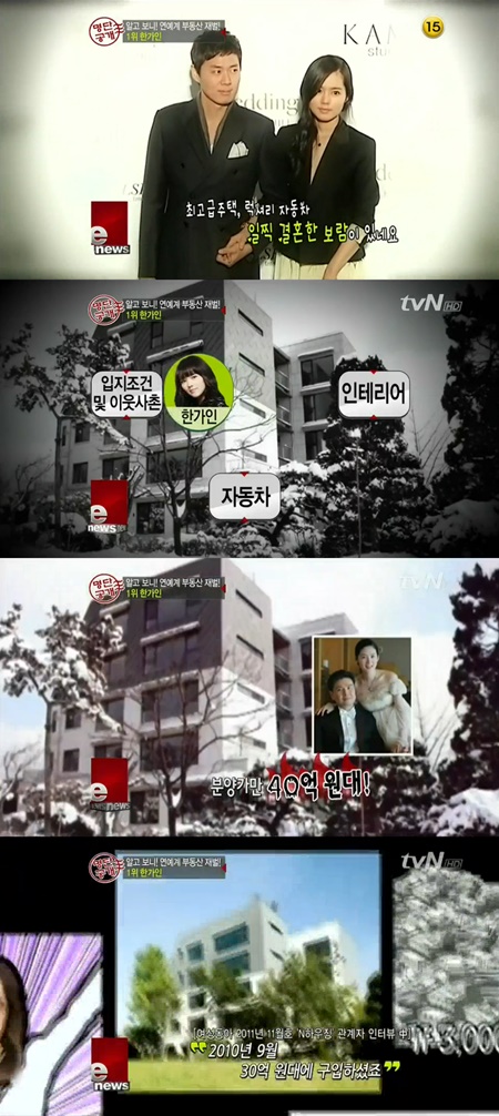 이날 방송에서 '연예계 부동산 재별' 1위로는 한가인 연정훈 부부가 이름을 올렸다. 한가인의 집은 서울 남산 자락에 위치한 고급 주택으로, 90~153평으로 이뤄진 대형주택이었다. 한 층에 한 가구만 살고 있는 펜트하우스 구조로, 사생활 노출을 꺼려하는 유명인들이 살기에는 적합한 구조를 갖추고 있다.