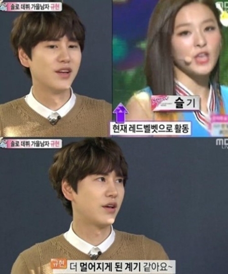 이날 리포터가 규현에게 '연습생 슬기 데뷔'를 언급했다. 그러자 규현은 "예뻐하는 후배인데 지금은 말도 못 걸겠다"며 "주위에서 '규현이가 슬기한테 말 건다' 그럴까봐 걱정된다. 더 멀어지게 된 계기가 됐다"고 털어놨다.