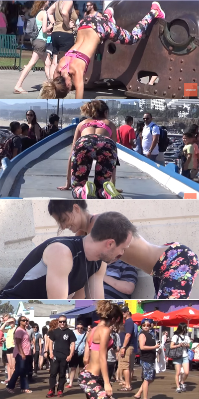 해당 영상 속 여성은 꽃무늬 레깅스 팬츠를 입고 엉덩이를 위아래, 양옆으로 사정 없이 흔들어대며 매력적인 엉덩이 춤을 선보인다. 화끈한 엉덩이 춤을 본 관광객들은 흐뭇한 표정으로 환호와 박수를 보내며 감상하는 모습이다.
