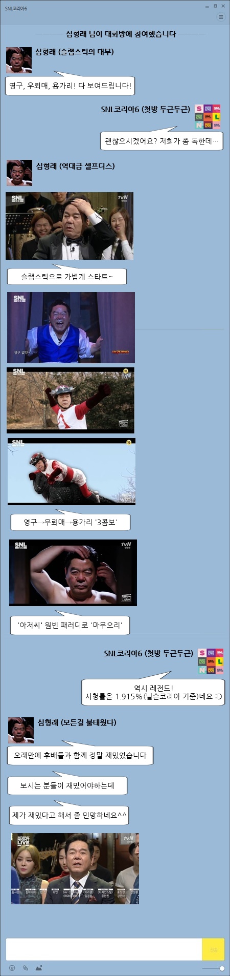 ‘심타쿠’ 심형탁의 등장에 ‘SNL코리아6’도 오랜만에 활짝 웃었다. 오프닝 무대에서 ‘미니언즈’에서 나온 OST를 부르면서 등장한 심형탁은 최근 인기에 대해 “다 거품이다. 곧 사라질 거다”라고 겸손한 모습을 보였다. 이후 심형탁은 첫 콩트에서 숨겨놓은 복근을 공개하면서 ‘상남자’의 면모를 보이는가 하면 ‘오덕고’ 콩트에서는 각종 ‘덕후’들이 모인 학교에서 자신이 좋아하는 ‘도라에몽’에 대한 해박한 지식을 드러내며 진정한 ‘덕후’임을 증명했다. 특히 심형탁은 클로징 무대에서 그동안 참았던 눈물을 터뜨리며 자신에게 쏟아지고 있는 큰 사랑과 관심에 대한 고마움을 드러냈다. 시청률은 닐슨코리아 기준 2.7%로, ‘SNL코리아6’에서 최고 시청률을 기록했다.