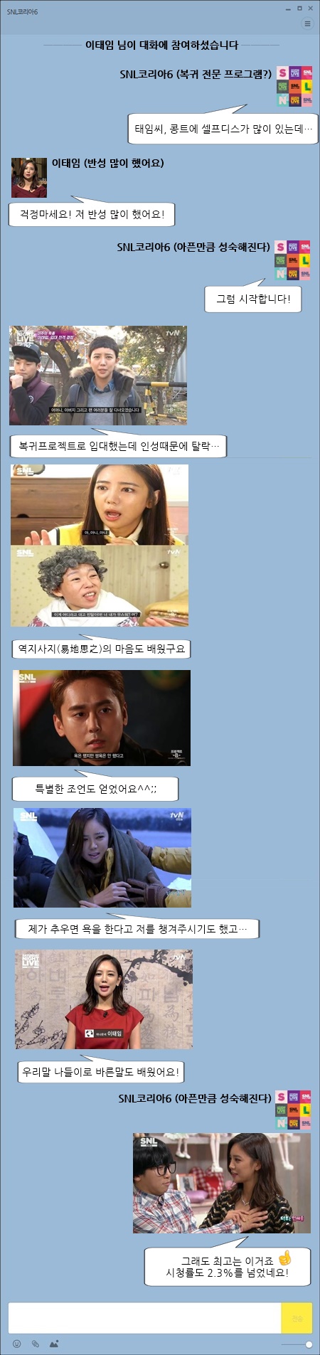 ‘욕설 논란’으로 자숙의 시간을 가졌던 이태임이 ‘SNL코리아6’를 통해 정면 돌파에 나섰다. 담담하게 자신의 심경을 고백하고 예원을 향해 사과한 이태임은 “정말 100% 내 잘못이다. 무조건 내가 잘못했다. 내가 언니이고 피해를 입고 있을 예원에게 죄송하다는 말을 드리고 싶다”고 말했다. 이후 이태임은 자신을 디스하는 내용이 담긴 콩트를 담담하게 소화하면서 ‘논란’을 정면 돌파했다. 시청률은 닐슨코리아 기준 2.2%