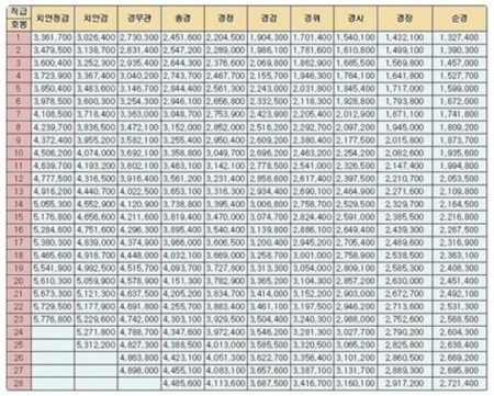 공개된 표에 따르면 가장 낮은 직급의 순경 1호봉의 봉급은 132만 7400원이다. 호봉이 올라갈 수록 봉급은 조금씩 높아지며, 순경 12호봉이 되면 205만 3500원을 수령한다.