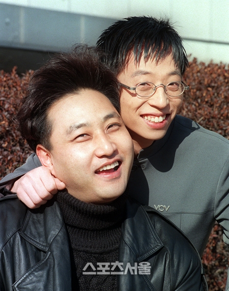 유재석과 그의 개그맨 데뷔 동기인 김수용의 익살맞은 사진. 두 사람의 풋풋했던 모습이 돋보인다.