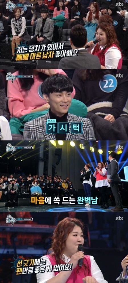 이어 이국주는 "노래도 좋지만 외모도 이상형이다. 내가 덩치가 있어서 빼빼 마른 남자 좋아한다. 턱이 뾰족한 남자를 좋아한다. 딱이다"고 덧붙였다.