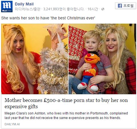 [스포츠서울] 자신의 아들에게 더 많은 크리스마스 선물을 사주기 위해 포르노 배우가 된 한 엄마의 사연이 눈길을 끌고 있다.