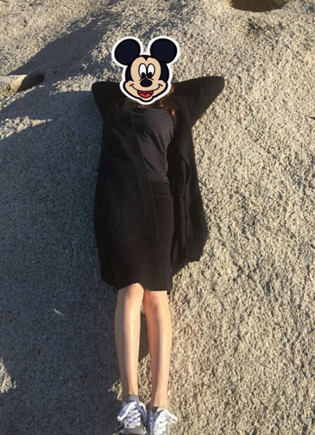 얼굴을 미키마우스 스티커로 가리고 있는 신수지는 몸매가 드러나는 의상으로 아찔한 볼륨감과 매끈한 각선미를 과시하고 있다.