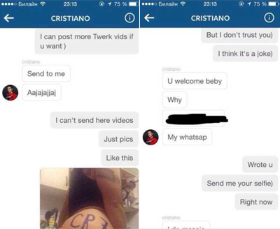 엉덩이 사진을 받은 호날두는 격한 반응을 보였고, 그에게 메신저 '왓츠앱' 아이디를 알려주며 자신은 진짜 호날두가 맞다고 주장했다.