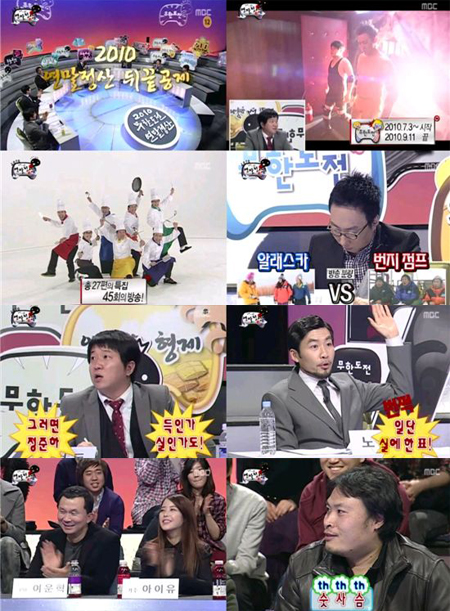 [스포츠서울] 또 한번 '무한도전'식 토론이 펼쳐진다. 지난달 30일 방송된 MBC '무한도전'에서는 대한민국 대표 예능인들이 총출동한 '예능 총회'가 예고됐다. '예능 대부' 이경규부터 'MBC 연예대상 수상자' 김구라, 2015 예능판을 종횡무진한 김영철, 서장훈, 김숙, 윤정수 등이 2016 예능의 트렌드에 대한 열띤 토론을 펼칠 예정이다. 지난 2011년 '연말정산 뒤끝공제' 특집으로 시청자들에게 큰 재미를 안겨준 바 있는 '무한도전'이 이번에는 '예능 총회'로 신년 특집을 꾸려 벌써부터 어떤 웃음을 안겨줄 것인지 기대를 모으고 있다. 이렇듯 토론 포맷은 신년을 맞이해 한 해를 돌아보는 형식으로 꾸려지기도 했지만 사실 지난 2007년부터 웃음과 변화가 필요한 순간 적절하게 사용돼 왔다. 햇수로 11주년을 맞이한 '무한도전'의 대표 특집 중 하나로 자리매김한 토론 특집의 그 시작과 유쾌했던 순간들을 모아봤다.