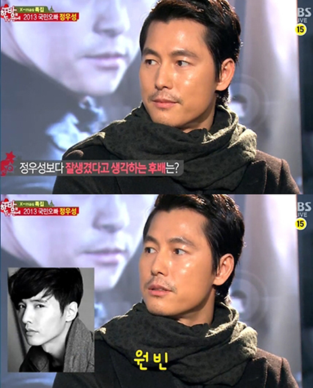 ‘후배 연기자 중 자신보다 잘생긴 후배가 누구라 생각하냐’는 리포터의 질문을 받은 정우성은 망설임 없이 원빈을 지목, “잘생겼다”고 밝혀 놀라움을 자아냈다.