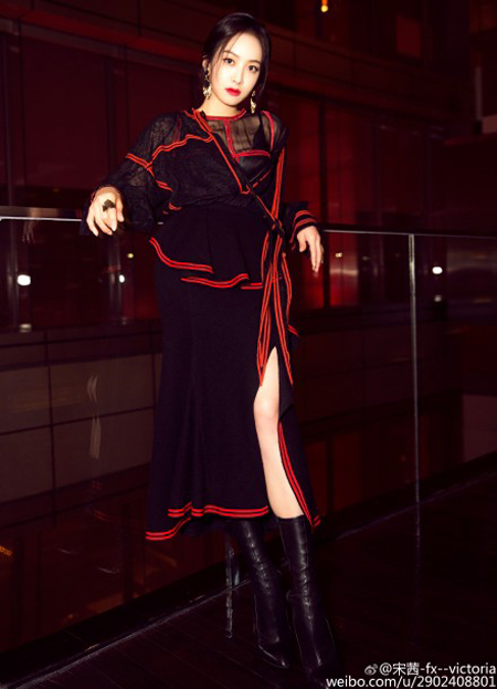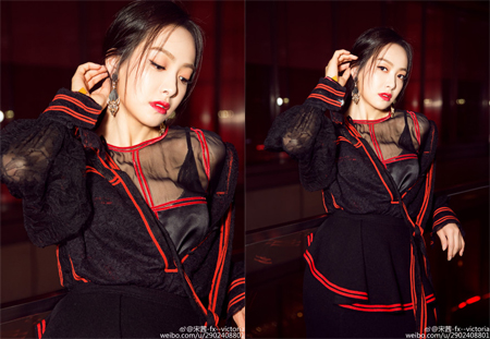 10일 오후 빅토리아는 자신의 웨이보를 통해 "제가 먼저 공개합니다~오늘 밤 '미려적비밀' 보셨나요?"라는 글과 함께 여러 장의 화보를 공개했다.