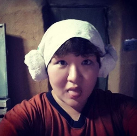 찜찔방에서 여가 시간을 보낸 하재숙은 깜찍한 표정과 함께 카메라를 응시하고 있다.