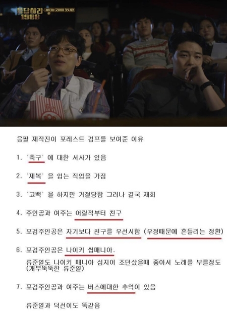 지난 9일 방영된 ‘응팔’ 18회에서는 동룡(이동휘 분)과 정환이 영화관을 찾아 영화 ‘포레스트 검프’를 보는 장면이 나왔다. 이에 한 네티즌은 ‘응팔 제작진이 포레스트 검프를 보여준 이유’라며 7가지 이유를 열거했다. 이 네티즌에 따르면 영화 속 주인공과 정환이 ‘축구’에 대한 서사가 있고, ‘제복’을 입는 직업을 가졌다. 또한 영화 속 주인공 역시 여주인공과 어릴 적부터 친구라는 점 등을 이유로 들었다. 이는 부정할 수 없게 딱 맞아 떨어지는 이유로 정환이 덕선의 남편임을 가리킨다는 주장이다.