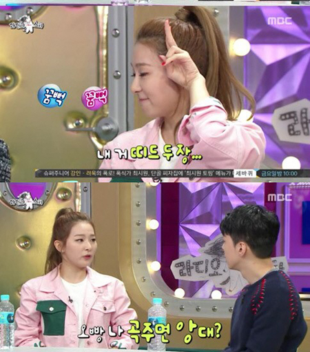 이날 슬기는 “'지붕 뚫고 하이킥'에 황정음 선배 치즈버거 애교 아시느냐. 일단 입꼬리를 올려야 한다”며 “오빠 나 띠드버거 먹고 티퍼용. 아앙 나 띠드버거. 나 띠드 두 장”이라고 혀 짧은 소리로 깜찍한 애교를 선보였다.