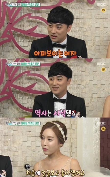 이날 방송에서 황제성은 "늘 꿈꿔왔던 이상형이 있었다. 아파보이는 청초한 여자여서 꽂혔는데 처음에 말을 못하다가 어느 날 집에 바래다주면서 역사가 시작됐다"고 박초은과 첫 만남을 회상했다.
