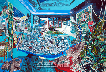 권인경(37) 작가는 체험과 사고 그리고 자라 온 이야기가 도시공간에 녹아, 확산되는 광경을 화면에 펼쳤다. 푸른 캔버스에 수묵화나 옛 책자를 콜라주하고 아크릴 채색을 입혀 내용과 표현 방법을 다양하게 보여준다.