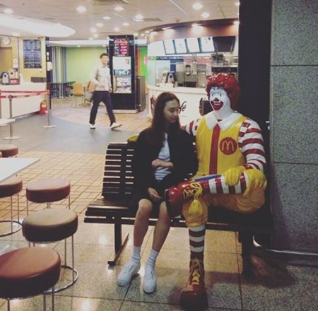 패스트푸드점 마스코트와 함께 나란히 앉아있는 류혜영은 재치 있는 문구에 어울리는 깜찍한 일상 복으로 시선을 사로잡았다.