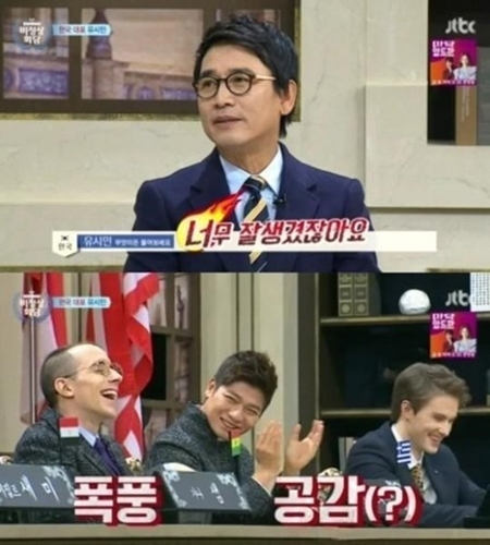 25일 방송된 JTBC '비정상회담'에는 최근 '썰전-독한 혀들의 전쟁'(이하 '썰전')에서 맹활약 펼치고 있는 유시민 작가가 게스트로 출연했다.