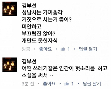 김부선은 "성남 사는 가짜 총각. 거짓으로 사는 게 좋냐. 미안하고 부끄럽진 않냐. 아들도 둘 씩이나 있다면서 자중자애해라. 수치감도 모르고 고마운 것도 모르고 아직 오리발이다"라고 날선 비난을 이어갔다. 주어를 적지는 않았지만 여러 정황상 이 역시 이재명 시장을 겨냥한 것으로 보인다.
