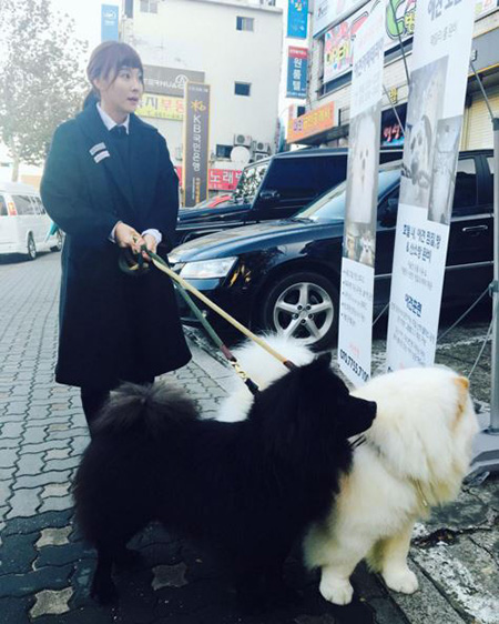 사진에는 두마리의 대형견 차우차우와 함께 어디론가 이동하는 모습이 담겼다.