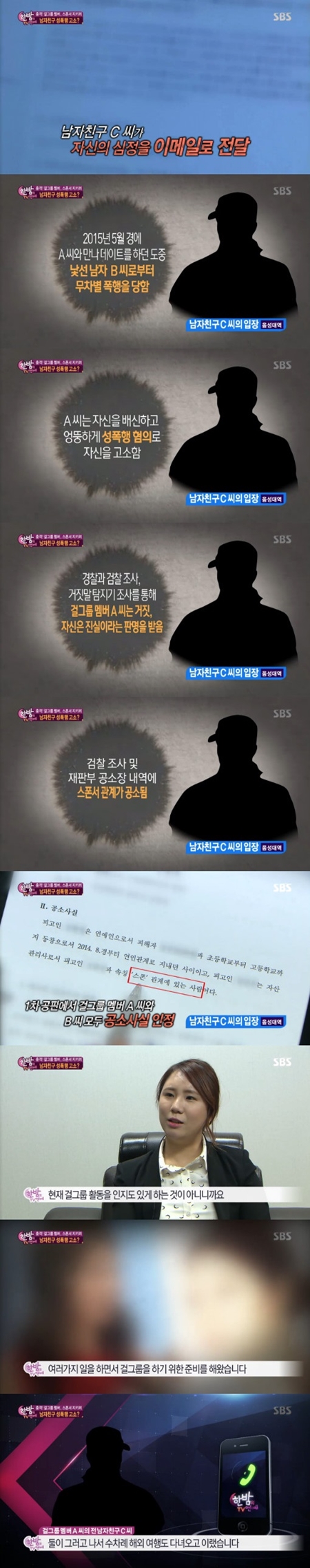 27일 방송된 SBS 연예정보 프로그램 '한밤의 TV연예'에서는 스폰 관계를 지키려 전 남자친구 C씨를 성폭행 혐의로 고소한 걸그룹 멤버 A씨에 관한 진실이 그려졌다.