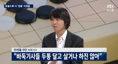 또 "드라마에서는 (바둑기사가) 외곬로 나오고 항상 두통을 달고 사는데 현실도 그렇냐?"는 손 앵커의 물음에, 이세돌은 "외곬이라는 건 잘 모르겠다. 프로기사 입장에서 내가 평가하기는 그렇지만 두통을 달고 사는 건 아니다"고 답했다.