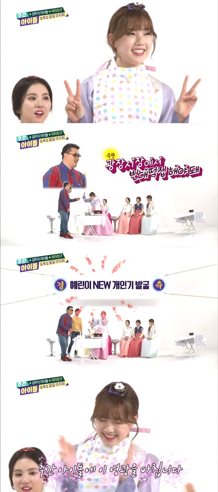 이날 '주간 미식회' 코너에서 여자친구는 순대국밥을 걸고 '전 뒤집기' 대결에 나섰다. 대결 종목에 예린은 자신있어 하는 표정을 지어보였다.