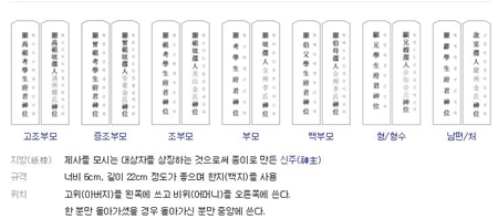 지방에 들어가는 내용은 제사를 모시는 사람과 고인과의 관계, 직위, 고인의 이름 등이며 마지막에 신주를 모셔두는 자리를 의미하는 신위(神位)를 적는다. 일반적으로 아버지의 경우 현고학생부군신위(顯考學生府君神位)로 적고 어머니의 경우 현비유인김해김씨신위(顯孺人金海金氏神位)로 적는다.