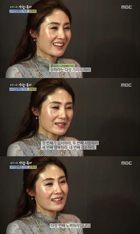 13일 방송된 MBC '사람이 좋다'에서는 시각장애인 가수 오하라의 이야기가 그려졌다.