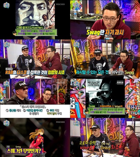 이어 데프콘은 ‘힙(합)선비’로 알려진 강일곤 편집장을 게스트로 초대해 본격적으로 힙합 역사에 대해 이야기하기 시작했다. 자메이카 출생 DJ로 턴테이블을 이용한 브레이크 비트를 처음으로 만든 디제이 쿨 허크는 자메이카에서 뉴욕으로 옮겨왔지만 형편이 어려워 옷을 사 입을 형편이 안됐다. 그래서 쿨 허크는 방을 빌려서 파티를 기획했고, 파티에서 주로 레게음악을 틀었지만 큰 호응을 얻지 못했고, 대안으로 R&B와 디스코를 접목해 그렇게 힙합의 시초가 탄생됐다.