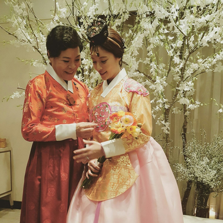지난 26일 오후 서울 중구 신라호텔에서 황정음과 프로골퍼 겸 사업가 이영돈 씨가 결혼식을 올린 가운데 두 부부에게 한복을 제공해 준 한복 디자이너 박술녀와 황정음의 비공개 컷이 공개됐다.