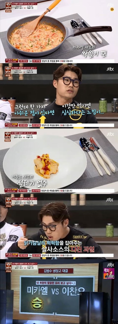 29일 방송된 JTBC 예능프로그램 '냉장고를 부탁해'에서는 김범수의 냉장고 재료로 이찬오와 미카엘이 대결을 벌이는 모습이 전파를 탔다.