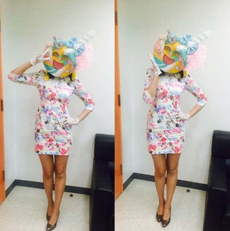정인영은 롤리팝 가면을 착용한 채 깜찍한 포즈로 인증샷을 찍었다.