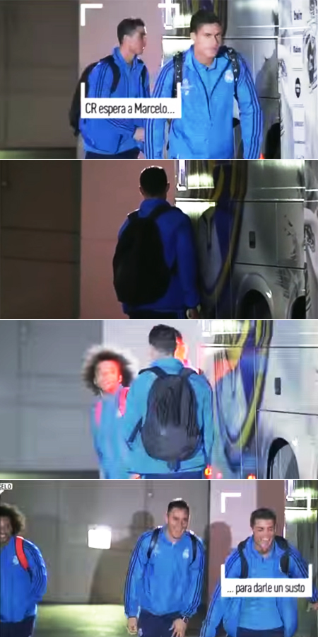 호날두의 장난질에 화들짝 놀란 사람은 다름 아닌 마르셀루. 마르셀루가 등장하자 호날두는 과장된 몸동작과 함께 그를 놀리는 모습이다.