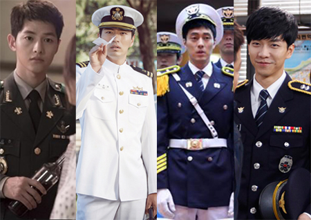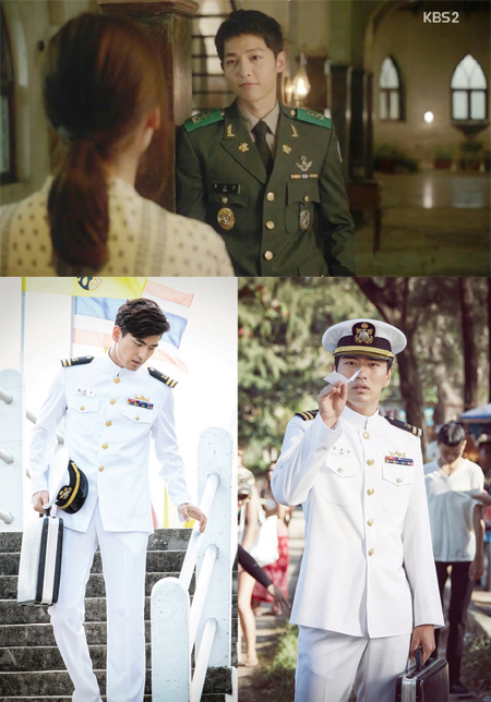 '태양의 후예' 유시진 역의 송중기는 훈훈한 외모로 작은 키를 커버해 제복을 우월하게 소화하고 있다. 매회 정복뿐만 아니라 전투복, 우르크 파병 군복 등을 소화해내며 여자들에게 '군복 판타지'를 채워주고 있다.