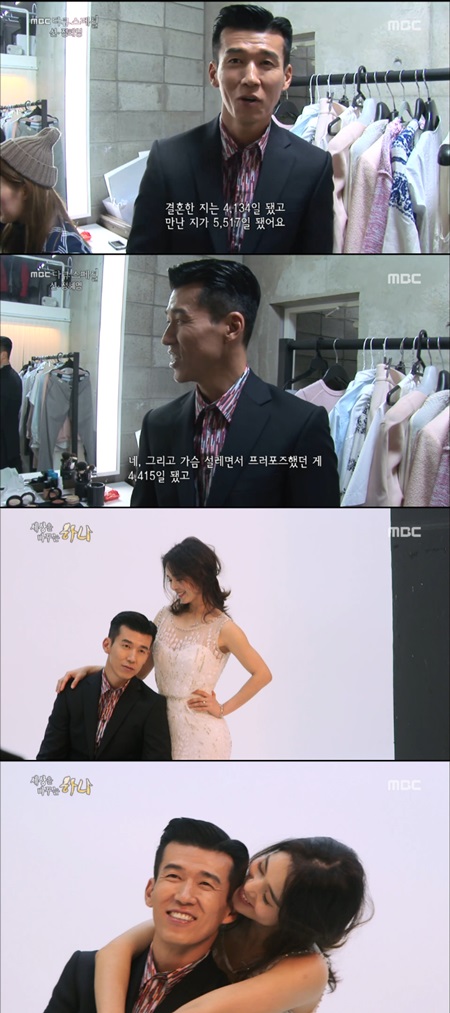 션은 "정혜영과 결혼한지 4134일 됐고, 만난지는 5517일이 됐다"며 "가슴 설레면서 프러포즈 했던 게 4415일 됐다"고 말해 모두를 놀라게 했다.