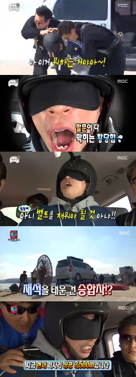 승합차에 탑승한 유재석에게 뒤에서 스카이다이빙 교관이 스카이다이빙을 뛰기전 실제로 행하는 동작을 취했고 유재석은 두려움에 어쩔 줄 몰라했다.