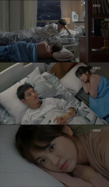 7일 방송된 KBS2 수목드라마 '태양의 후예'에서는 유시진(송중기 분)과 강모연(송혜교 분)이 병실 데이트를 즐기는 모습을 그렸다.