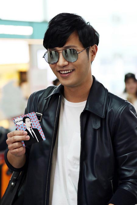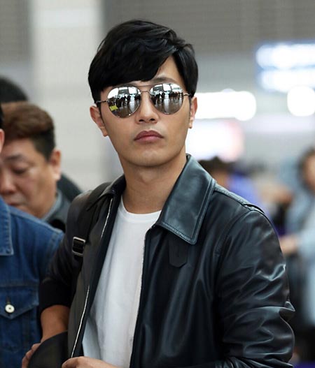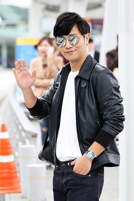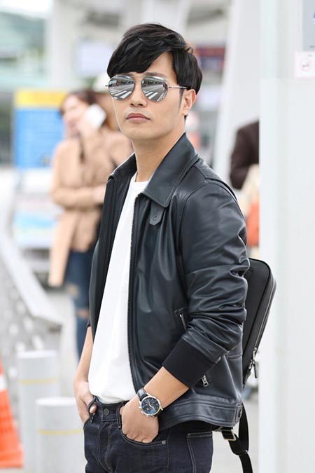 이날 진구는 스포티한 디자인의 블랙 가죽 재킷에 화이트 티셔츠를 매치해 시크하면서도 남성미 넘치는 공항 패션을 선보였다.