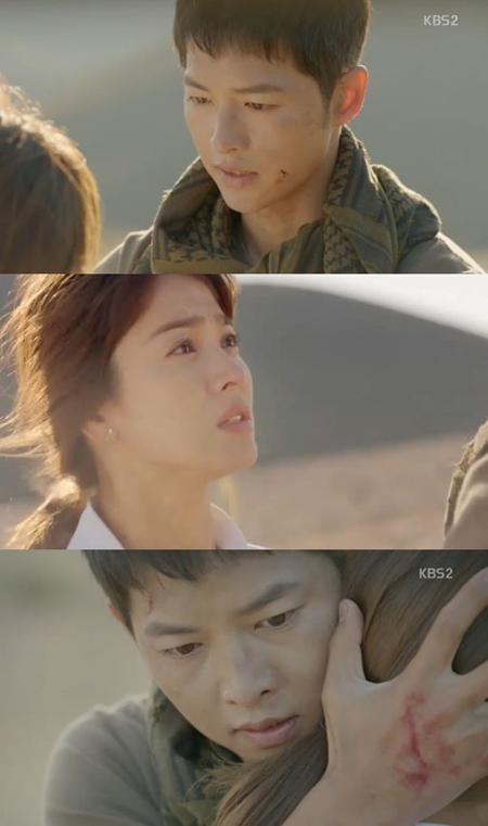 14일 오후 방송된 KBS2 수목드라마 '태양의 후예'에서는 유시진(송중기 분)과 강모연(송혜교 분)이 극적으로 재회했다.