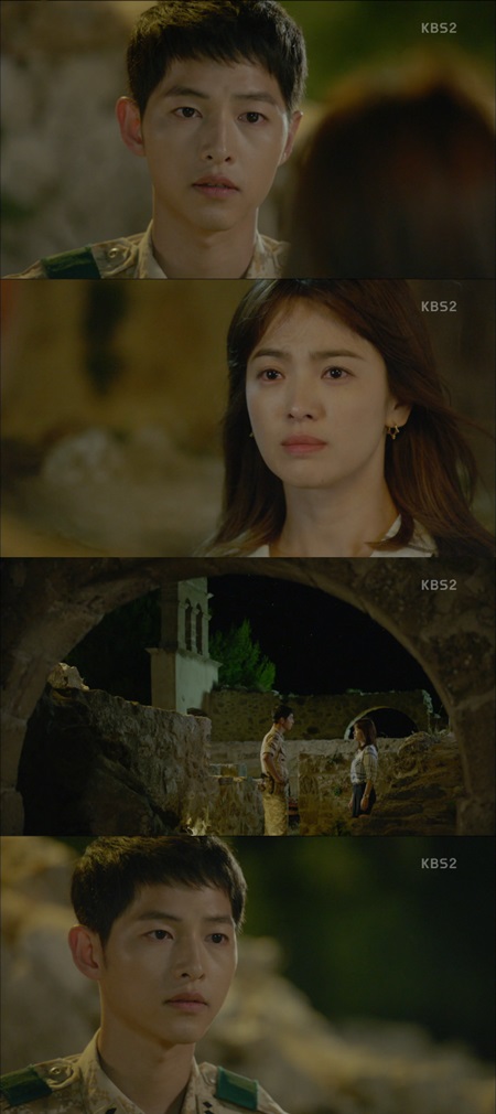 강모연은 절벽에 차가 위태롭게 매달리는 위기에 처했다. 이때 유시진이 나타나 강모연을 구했다. 유시진의 송별회를 알게 된 강모연은 그의 고백을 거절했고, 유시진은 파병기간이 끝나 한국으로 복귀했다. 하지만 우르크에 강한 지진이 발생하면서 유시진은 서대영(진구 분)과 함께 다시 우르크로 향했다. 유시진은 강모연의 풀린 신발 끈을 묶어주면서 그를 걱정했고, 그렇게 두 사람은 재난 현장에서 인명구조를 위해 다시 발걸음을 옮겼다.
