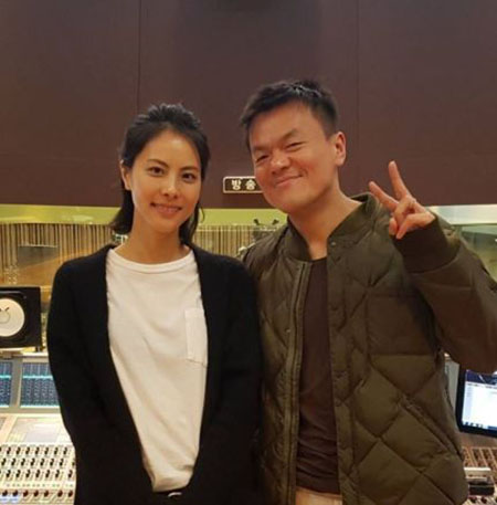 공개된 사진 속 박진영은 박지윤과 다정한 포즈를 취한 채 카메라를 응시하고 있다.